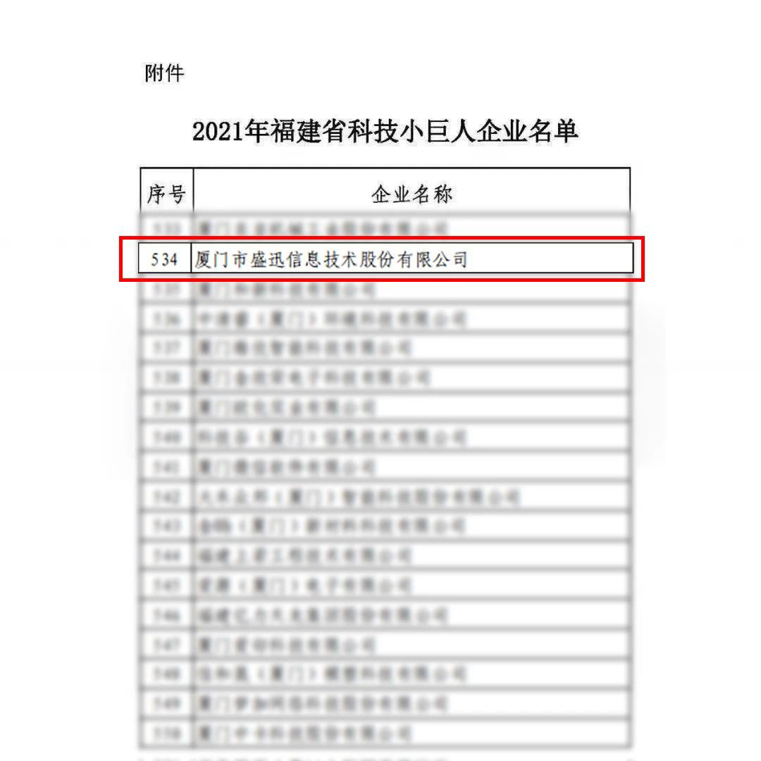 喜讯 | 盛迅信息荣获“2021年福建省科技小巨人”荣誉称号