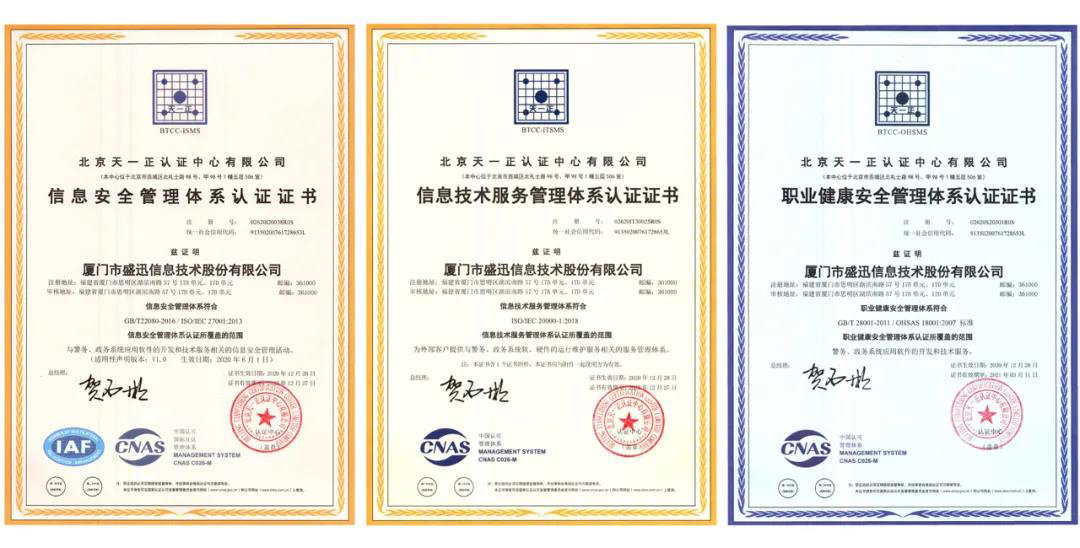 近日,经过第三方机构的严格考察和审核,厦门市盛迅信息技术股份有限公司(以下简称“盛迅信息”)获得ISO20000“信息技术服务管理体系标准”、ISO27001 “信息安全管理体系标准”及OHSMS18001“职业健康安全管理”管理体系认证。这表明盛迅信息的管理体系已达到国内、国际先进管理标准,有能力组织实施并有效运行ISO体系,标志着盛迅信息的管理、服务水平及企业运营迈上了一个新台阶。