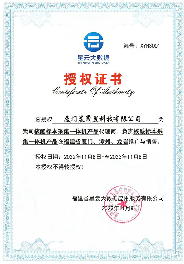 11月8日,盛迅信息生态共荣伙伴-厦门晨晟昱科技有限公司获得官方授权,正式成为福建星云大数据“核酸标本采集一体机”产品代理商,全权受理福建省内厦门、漳州、龙岩三地销售事宜。