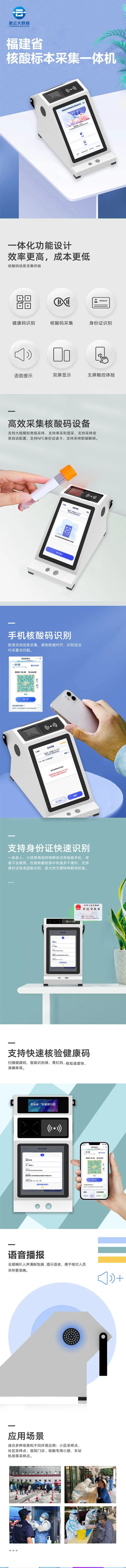 福建省核酸标本采集一体机是一款接入福建省区域核酸检测信息系统并实时同步数据,将健康码核验、市民信息采集等核酸标本采集流程自助式、自动化的智能防疫装备,有效节省50%人力,支持单管、多管、多合一混采、24小时持续高效运作,用于常规采样、大规模筛查等业务场景,有效提升核酸检测的工作效率。